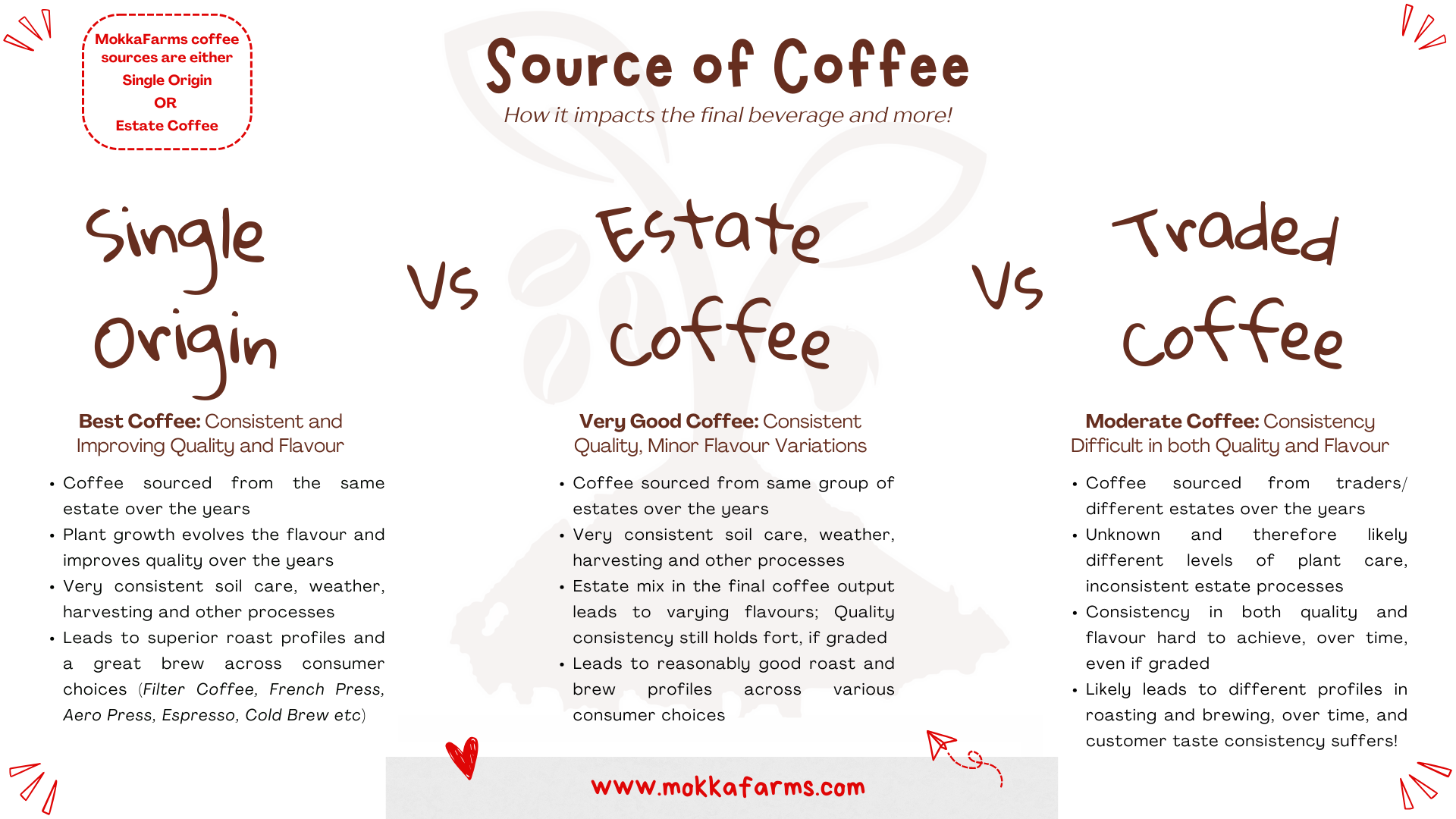MokkaFarms brings you an exclusive High Quality, Estate Coffee, Fresh Roast, 100% Pure, Sundried Arabica & Robusta Whole Coffee Beans from Coorg/ Chikmagalur region of Western Ghats, Karnataka, India. Our coffee beans are further selectively picked to ensure that you have a superior grade coffee beans. The beans are carefully selected and roasted, separately in small batches, to perfection as per the roast type and pack size that you need, to create a strong, flavourful and an extremely gratifying and a rich aromatic coffee experience. The result is a smooth and balanced cup of coffee with a unique flavor profile. The Roasted Whole Coffee Beans from Mokka Farms give the coffee a mild and fruity taste with a hint of chocolate. The brewing method enhances the flavors and aromas, resulting in a full-bodied and satisfying cup of coffee. The coffee can be enjoyed hot or cold and is perfect for those who appreciate a strong and flavorful coffee. Whether you prefer a classic cup of black coffee or a creamy and sweet latte, this coffee blend will satisfy your cravings. Indulge in the rich and authentic taste of one of the best Robusta Coffee Beans that you can find in the country.