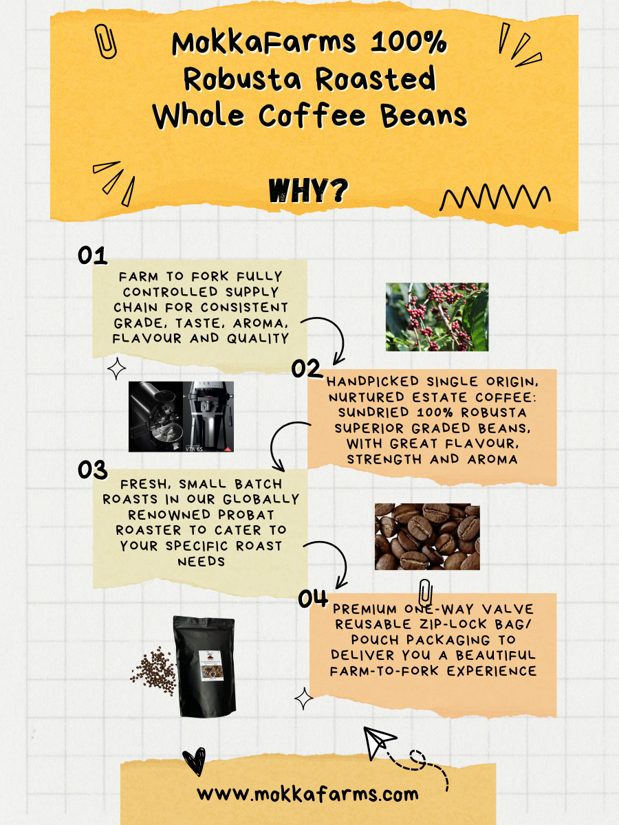 - FLAVOURFUL COFFEE: Treat yourself to the exquisite flavors of MokkaFarms 100% Arabica Robusta Blend Roasted Whole Coffee Beans, a sensory experience like no other